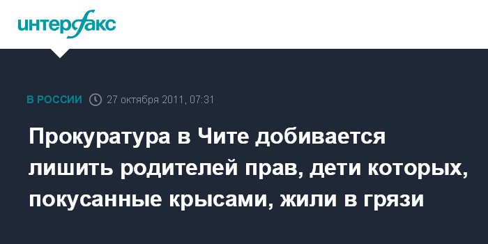 Чита. 27 октября. INTERFAX.RU - Прокуратура Железнодорожного района Читы потребовала в суде лишить родительских прав родителей, у которых дети жили в грязи и были покусаны крысами, сообщает в четверг пресс-служба прокуратуры Забайкальского края.