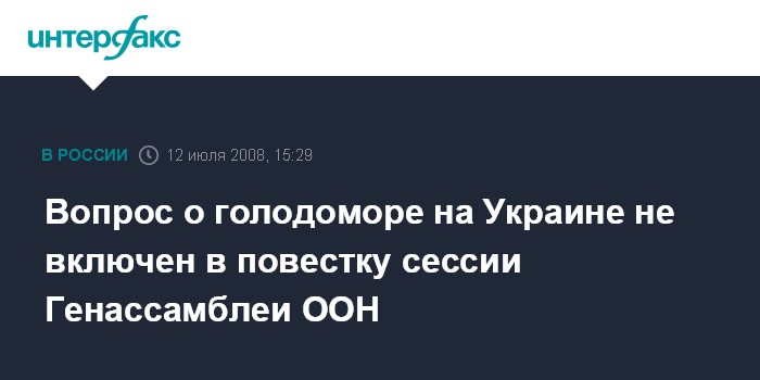 Москва. 12 июля. INTERFAX.RU - Генеральная ассамблея ООН отказалась включать в повестку своей нынешней сессии вопрос о голодоморе на Украине в 1930-х годах.