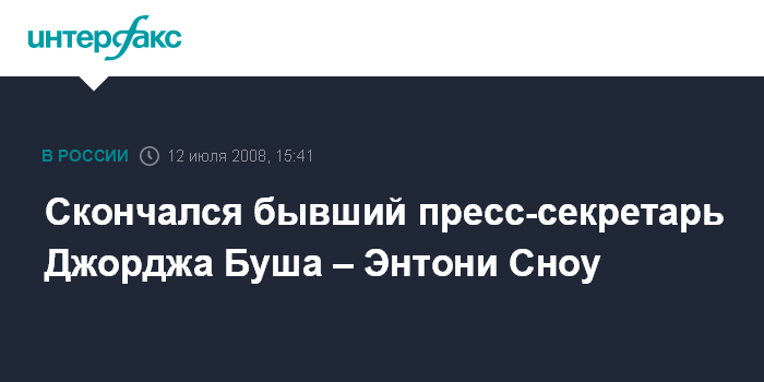 Москва. 12 июля. INTERFAX.RU - Бывший обозреватель телеканала "Фокс Ньюс" и пресс-секретарь Джорджа Буша Энтони Сноу в субботу скончался от рака в одной из американских клиник, сообщает сайт газеты "Лос-Анджелес Таймс".