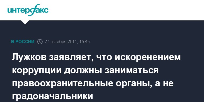 "Когда мы говорим о коррупции, то в нашей стране искоренением этого зла должны заниматься правоохранительные органы. И если (глава администрации президента) Сергей Нарышкин заявляет о разгуле коррупции в столице, где размещены все правительственные учреждения, то первый вопрос надо адресовать ему самому и другим высшим госчиновникам", - заявил Ю.Лужков "Интерфаксу" по телефону в четверг.