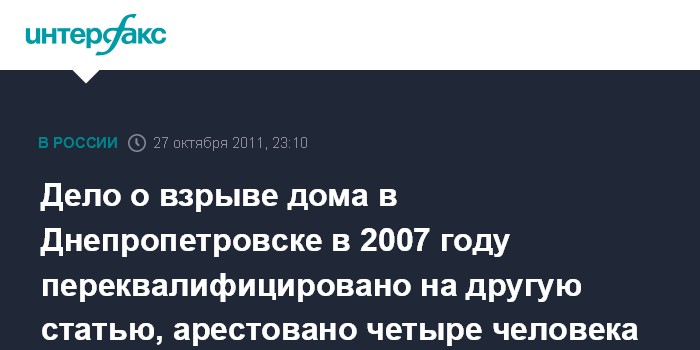 Днепропетровск. 27 октября. ИНТЕРФАКС-УКРАИНА- В деле о взрыве газа в Днепропетровское в 2007 году прокуратура Днепропетровской области переквалифицировала статью обвинения и взяла под стражу четырех обвиняемых, сообщила прокурор Днепропетровской области Наталья Марчук.