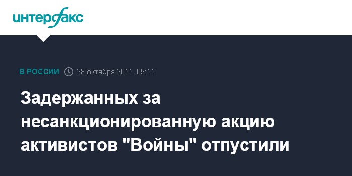 Москва. 28 октября. INTERFAX.RU - Двоих активистов арт-группы "Война" отпустили из отделения полиции.