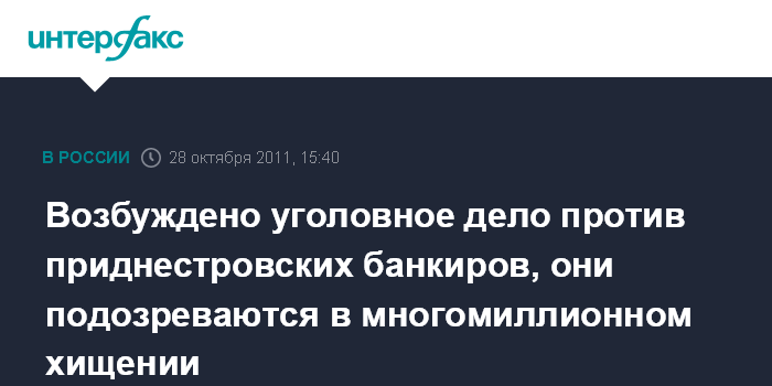Москва.28 октября. INTERFAX.RU - Следственные органы СК РФ возбудили уголовное дело против топ-менеджеров Приднестровского республиканского банка, подозреваемых в хищении и присвоении чужого имущества.