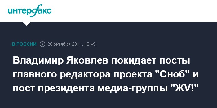 "Юрий Кацман перестает занимать должность генерального директора медиа-группы "ЖV!". Он сохраняет пост главного редактора издания F5 (f5.ru). Владимир Яковлев покидает пост главного редактора проекта "Сноб" и пост президента медиа-группы "ЖV!", - указывается в тексте сообщения, поступившем в пятницу "Интерфакс".