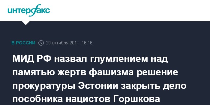 Москва. 29 октября. INTERFAX.RU - В Москве подвергли резкой критике решение Государственной прокуратуры Эстонии о прекращении расследования по уголовному делу гражданина этой страны Михаила Горшкова, обвиняемого в совершении преступлений на территории Белоруссии в годы Второй мировой войны.