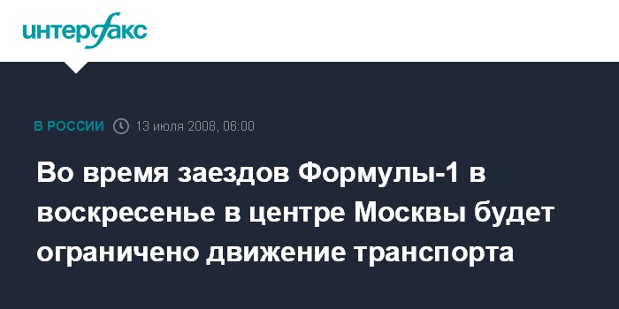 Москва. 13 июля. ИНТЕРФАКС-МОСКВА - В связи с проведением 13 июля показательных заездов Формулы-1 с 10:00 до 18:00 будет ограничено движение автотранспорта в центре Москвы, сообщили "Интерфаксу" в управлении ГИБДД столицы.
