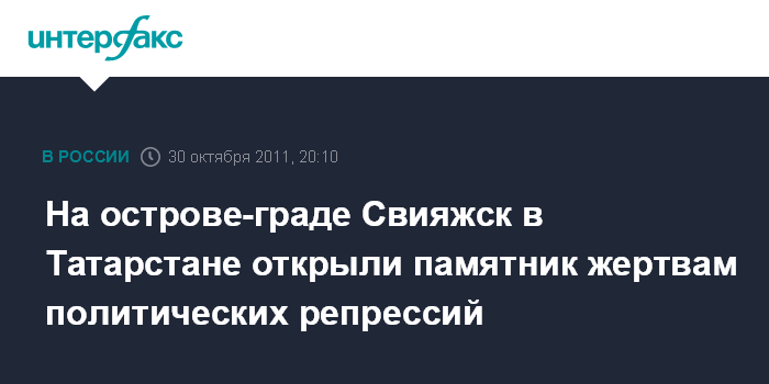 Казань. 30 октября. ИНТЕРФАКС-ПОВОЛЖЬЕ - Более 200 человек из разных регионов России в воскресенье приняли участие в церемонии открытия памятника жертвам политических репрессий на острове-граде Свияжск (Зеленодольский район, Татарстан), сообщается на официальном сайте правительства республики.