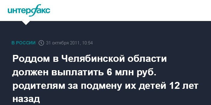 Челябинск. 31 октября. INTERFAX.RU - Копейский городской суд (Челябинская область) на заседании в понедельник принял решение о взыскании с местного роддома 6 млн рублей в пользу родителей, новорожденных детей которых 12 лет назад перепутали по ошибке при выписке.