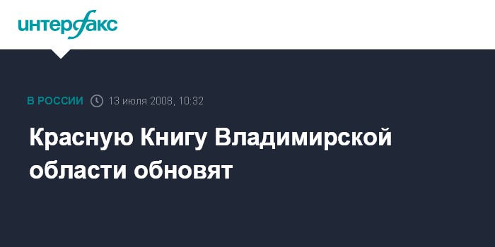 Москва. 13 июля. INTERFAX.RU- В Красную Книгу Владимирской области войдут 160 видов животных, сообщили "Интерфаксу" в пресс-службе обладминистрации.