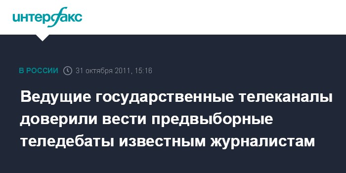 Москва. 31 октября. INTERFAX.RU - Предвыборные дебаты на ведущих государственных российских телеканалах будут вести известные тележурналисты.