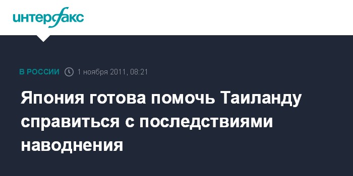 Токио. 1 ноября. INTERFAX.RU - Япония намерена оказать финансовую помощь Таиланду, пострадавшему от серьезного наводнения, сообщает телекомпания NHK.