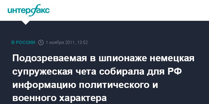 Берлин. 1 ноября. INTERFAX.RU - Задержанная в Германии семейная пара, подозреваемая в шпионаже в пользу России, предположительно занимались сбором военной и политической информации, сообщил во вторник веб-сайт немецкого издания "Шпигель".