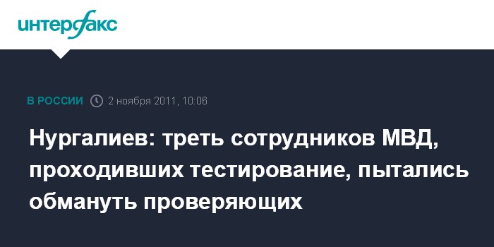 "В период внеочередной аттестации специальные психофизиологические исследования прошли около 13,5 тыс. сотрудников органов внутренних дел. Результаты показали, что около 4,2 тыс. из них скрывали факты, имеющие значение для принятия соответствующего кадрового решения", - заявил в эксклюзивном интервью "Интерфаксу" глава МВД РФ Рашид Нургалиев.