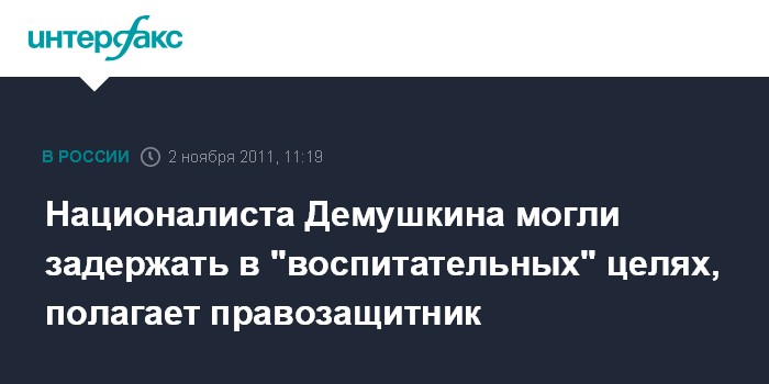 Москва. 2 ноября. INTERFAX.RU - Правозащитник считает, что один из лидеров движения "Русские" Дмитрий Демушкин задержан в Москве в воспитательных целях в преддверии акции "Русский марш", который националисты собираются провести в Москве 4 ноября.