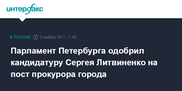 Санкт-Петербург. 2 ноября. INTERFAX.RU - Законодательное собрание Петербурга на заседании в среду одобрило кандидатуру Сергея Литвиненко для наделения полномочиями прокурора города, передал корреспондент "Интерфакса".