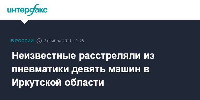 Иркутск. 2 ноября. INTERFAX.RU - Девять легковых автомобилей обстреляны на парковке во дворе жилого дома в городе Братск Иркутской области, сообщила агентству "Интерфакс-Сибирь" пресс-секретарь муниципального управления МВД РФ по Братску Ирина Кирилова.