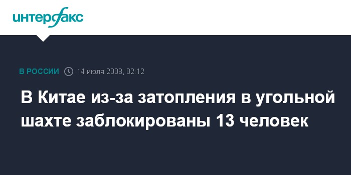 Пекин. 14 июля. ИНТЕРФАКС-КИТАЙ - В угольной шахте в городе Чанчжи центральной китайской провинции Шаньси в результате затопления забоя терпят бедствие 13 горняков, сообщили в понедельник местные СМИ.