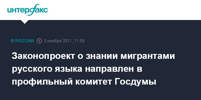 Москва. 3 ноября. INTERFAX.RU - Председатель Госдумы Борис Грызлов в четверг направил в думский комитет по конституционному законодательству и государственному строительству законопроект, который обязывает мигрантов подтверждать свое знание русского языка. Грызлов сообщил об этом на своей страничке в Твиттере.