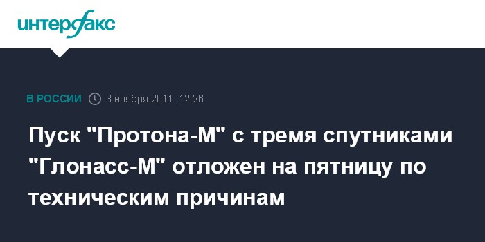 Москва. 3 ноября. INTERFAX.RU - Старт ракеты-носителя "Протон-М" с разгонным блоком "Бриз-М" и блоком из трех космических аппаратов "Глонасс-М", планировавшийся на четверг, перенесен на сутки, сообщили "Интерфаксу-АВН" в пресс-службе Роскосмоса.