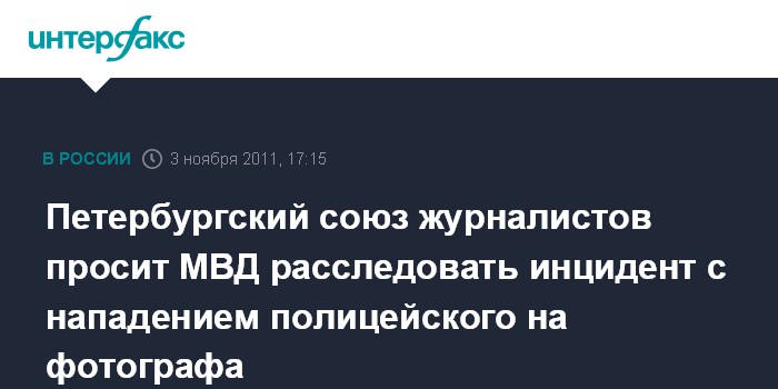 Санкт-Петербург. 3 ноября. INTERFAX.RU - Союз журналистов Петербурга и Ленинградской области призвал руководство Главного управления МВД по северной столице разобраться с нападением полицейского на фотографа, которое произошло 31 октября во время акции у Гостиного двора.