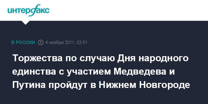 Москва. 4 ноября. ИНТЕРФАКС - Президент РФ Дмитрий Медведев и председатель правительства Владимир Путин в пятницу, 4 ноября, вместе посетят Нижний Новгород, где примут участие в торжествах, посвященных Дню народного единства.