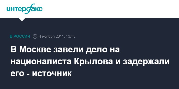 Москва. 4 ноября. INTERFAX. RU - В отношении одного из организаторов "Русского марша" Константина Крылова возбуждено уголовное дело, в пятницу он был задержан в Москве, сообщил Интерфаксу источник в правоохранительных органах. "В отношении Крылова накануне было возбуждено уголовное дело по статье "Разжигание межнациональной розни", - уточнил источник.
