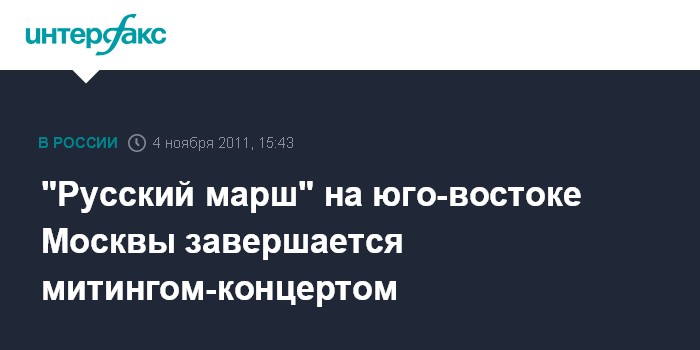 Москва. 4 ноября. INTERFAX.RU - Участники "Русского марша" завершили свое шествие на юго-востоке Москвы у памятника Солдату Отечества, где организаторы планируют провести митинг-концерт, передает корреспондент "Интерфакса".
