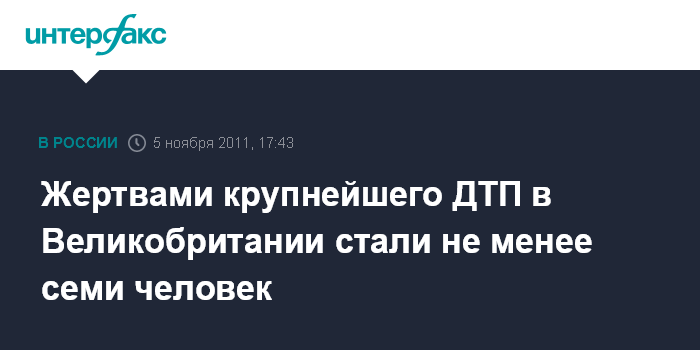 Лондон. 5 ноября. INTERFAX.RU - По меньшей мере, семь человек погибли и несколько десятков пострадали в одном из крупнейших ДТП в Великобритании за последние 20 лет, передает телерадиокорпорация Би-Би-Си. Авария произошла вечером в пятницу, когда 28 легковых машин и шесть грузовиков столкнулись на шоссе M5 в графстве Сомерсет, на юго-западе Англии.