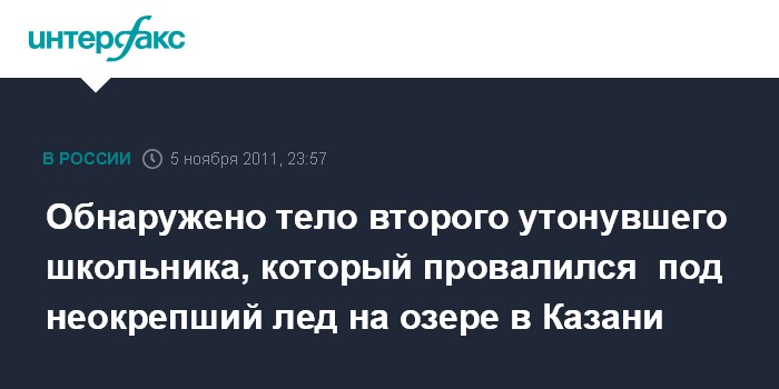 Казань. 5 ноября. ИНТЕРФАКС-ПОВОЛЖЬЕ - Водолазы МЧС Татарстана нашли и подняли на поверхность озера тело еще одного школьника, который вечером в субботу с двумя товарищами провалился под лед на озере в Авиастроительном районе Казани.