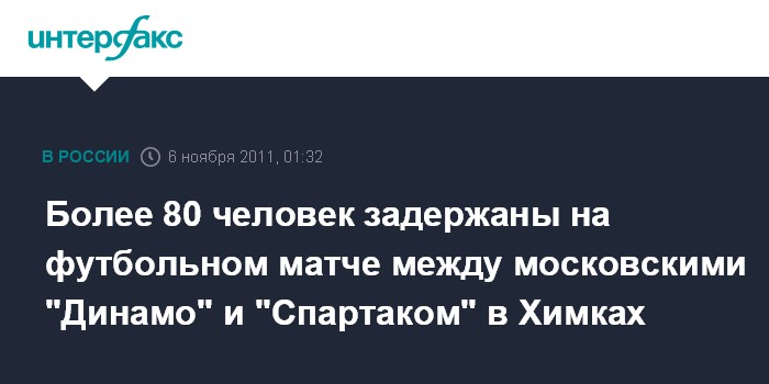 Москва. 6 ноября. ИНТЕРФАКС - Полиция задержала более 80 человек на матче между московскими футбольными клубами "Динамо" и "Спартак", прошедшем в субботу на подмосковном стадионе "Арена Химки", сообщили "Интерфаксу" в пресс-службе ГУ МВД России по Московской области.