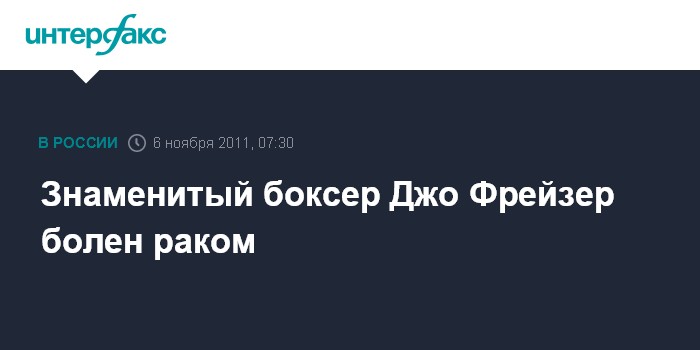 Лондон. 6 ноября. ИНТЕРФАКС - Экс-чемпион мира по боксу в тяжелом весе 67-летний Джо Фрейзер болен раком печени и находится в хосписе, сообщает британская телерадиовещательная корпорация "Би-би-си".