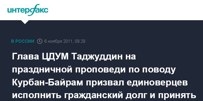 Глава ЦДУМ Таджуддин на праздничной проповеди по поводу Курбан-Байрам призвал единоверцев исполнить гражданский долг и принять участие в предстоящих выборах