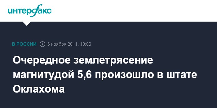 Вашингтон. 6 ноября. INTERFAX.RU - Землетрясение магнитудой 5,6 произошло в американском штате Оклахома после зарегистрированных ранее толчков магнитудой 5,2 , сообщили в воскресенье в Геологической службе США. На данный момент информации о пострадавших не поступало. По данным местных властей, в результате подземных толчков повреждены некоторые здания, происходят перебои движения на ряде автомагистралей.