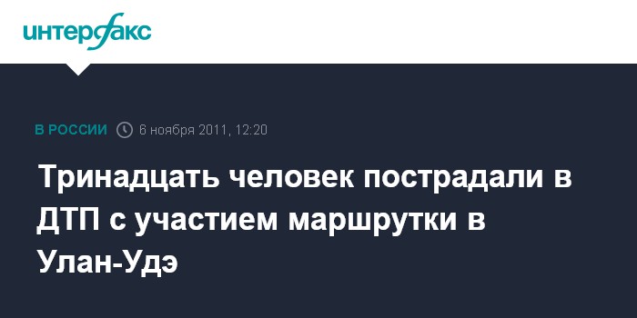 Улан-Удэ. 6 ноября. INTERFAX.RU - В результате столкновения маршрутного микроавтобуса и автомобиля Honda 13 человек госпитализированы с различными травмами, сообщает пресс-служба МЧС региона. ДТП произошло в воскресенье днем на перекрестке в поселке Солдатский города Улан-Удэ.