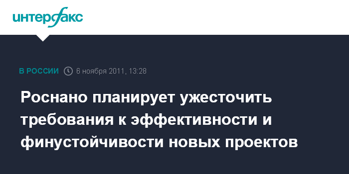 Москва. 6 ноября. INTERFAX.RU - ОАО "Роснано" планирует ужесточить требования к эффективности и финансовой устойчивости проектов, которые отбираются для инвестиций. "Мы обсуждаем повышение планки по IRR (internal rate of return, внутренняя норма доходности) и изменение требований по соотношению собственных и привлеченных средств в сторону увеличения последних", - заявил в интервью "Интерфаксу" глава "Роснано" Анатолий Чубайс.