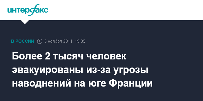 Париж. 6 ноября. INTERFAX.RU - Проливные дожди и грозы вызвали угрозу наводнений на юго-востоке Франции, более 2,3 тыс. человек были вынуждены покинуть свои дома, сообщают в воскресенье французские СМИ. Более 1,6 тыс. жителей были эвакуированы в департаменте Вар и еще 700 человек в департаменте Приморские Альпы. В 12 департаментах юга Франции объявлен предпоследний, "оранжевый" уровень тревоги.