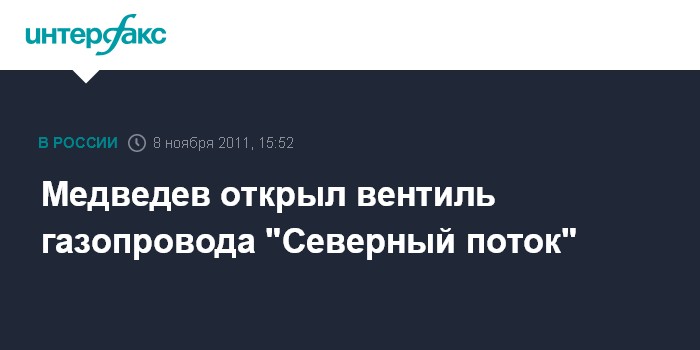 Как передает корреспондент "Интерфакса", президент РФ Дмитрий Медведев, канцлер Германии Ангела Меркель, премьер-министры Нидерландов Марк Рютте и Франции Франсуа Фийон, а также еврокомиссар по энергетике Гюнтер Эттингер во вторник в немецком Любмене открыли символический вентильный кран запорной арматуры газопровода "Северный поток", по которому российский газ придет в Европу, минуя транзитные страны.