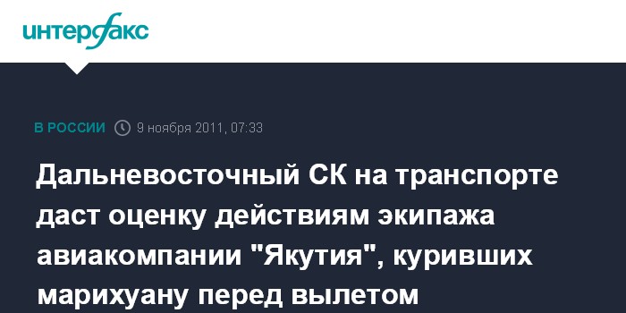 Владивосток. 9 ноября. ИНТЕРФАКС-ДАЛЬНИЙ ВОСТОК - Дальневосточное следственное управление на транспорте СКР проводит проверку по факту употребления марихуаны командира экипажа и бортпроводницы рейса N757 авиакомпании "Якутия" перед вылетом их самолета из Магадана в Москву.
