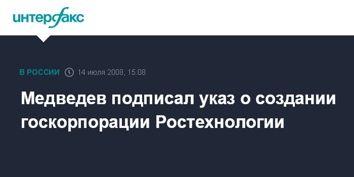 Москва. 14 июля. INTERFAX.RU - Президент России Дмитрий Медведев подписал указ "Вопросы госкорпорации по содействию разработке производству и экспорту высокотехнологичной промышленной продукции Ростехнологии", сообщила в понедельник пресс-служба президента.