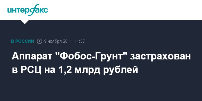 При этом источник на страховом рынке сообщил агентству, что стоимость "Фобос-Грунта" и, соответственно, размер страхового покрытия составляют около 1,2 млрд рублей.