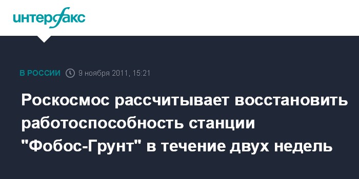 Москва. 9 ноября. INTERFAX.RU - В Роскосмосе считают, что шансы восстановить работоспособность автоматической межпланетной станции "Фобос-Грунт" будут сохраняться в течение ближайших двух недель.