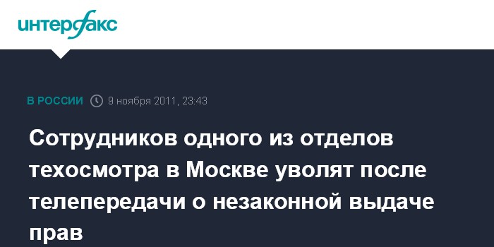 Москва. 9 ноября. INTERFAX.RU - ГИБДД Москвы официально сообщает об предстоящем увольнении из правоохранительных органов группы сотрудников одного из межрайонных отделов технического осмотра транспорта, регистрационной и экзаменационной работы (МОГТОТРЭР) за незаконную выдачу водительского удостоверения.