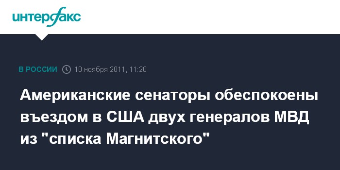 Москва. 10 ноября. INTERFAX.RU - Американские сенаторы потребовали от госсекретаря проверить законность въезда в США двух заместителей главы Следственного департамента МВД России в связи с их отношением к уголовному преследованию юриста фонда "Hermitage Capital" Сергея Магнитского, сообщили в фонде со ссылкой на газету Wall Street Journal.