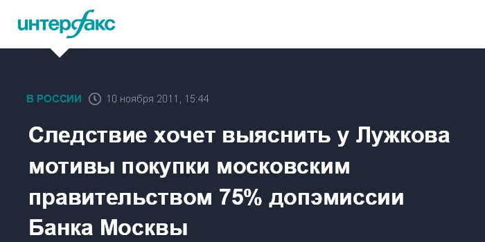 Москва. 10 ноября. INTERFAX.RU - Следствие намерено поинтересоваться у бывшего мэра Москвы Юрия Лужкова, по какой причине правительство столицы приняло решение выкупить три четверти допэмиссии акций Банка Москвы в 2009 г. на сумму 15 млрд рублй, сообщил "Интерфаксу" источник в правоохранительных органах.