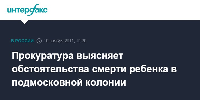 "Вечером 9 ноября в прокуратуру по надзору за исправительными учреждениями Московской области поступила информация о том, что в ЦРБ г. Можайска умер младенец, поступивший из Дома ребенка при ИК-5 УФСИН по Московской области. По данному факту проводится проверка", - заявила "Интерфаксу" в четверг официальный представитель прокуратуры Подмосковья Ирина Малинина.