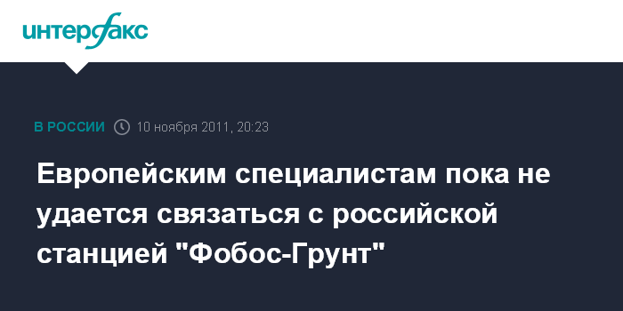 Москва. 10 ноября. INTERFAX.RU - Станции европейского космического агентства (ЕКА), расположенные во Французской Гвиане и Австралии, пока не смогли получить телеметрическую информацию с российского аппарата "Фобос-Грунт", сообщил глава российского представительства ЕКА в Москве Рене Пишель.