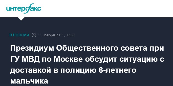Москва. 11 ноября. ИНТЕРФАКС - Председатель Общественного совета при ГУ МВД РФ по Москве Ольга Костина сообщила, что в пятницу, 11 ноября, на заседании президиума совета будет обсуждаться вопрос, связанный с доставкой в отделение полиции 6-летнего ребенка с Триумфальной площади.
