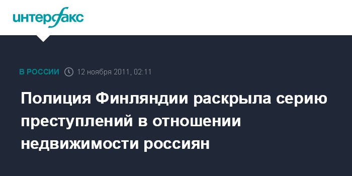 Хельсинки. 12 ноября. ИНТЕРФАКС - Полиция Финляндии раскрыла серию преступлений, связанных с недвижимостью россиян в районе города Иматра (Imatra).