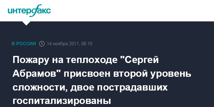 "Примерно в 5:50 мск пожару на теплоходе "Сергей Абрамов" был присвоен второй номер сложности по пятибалльной шкале", - сказал собеседник агентства.
