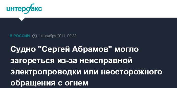 Судно "Сергей Абрамов" могло загореться из-за неисправной электропроводки или неосторожного обращения с огнем